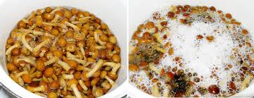 Для приготовления грибной эссенции (экстракта) можно использовать грибы не лучшего качества и остатки ножек. Грибы тщательно чистят, промывают водой и оставляют стечь. Потом их режут, добавляют соль, немного воды и тушат. Выделяющийся во время тушения сок сливают в отдельную посуду, а к грибам понемногу добавляют воду. Разваренные грибы измельчают миксером или протирают через сито. Полученную грибную пасту смешивают с соком, разогревают и при сильном кипении (постоянно помешивая) выпаривают до консистенции вязкого сиропа. Потом смесь еще горячей разливают по маленьким баночкам или бутылочкам, которые плотно закрывают и стерилизуют на водяной бане 40 минут при 90°С. Через два дня стерилизацию повторяют.